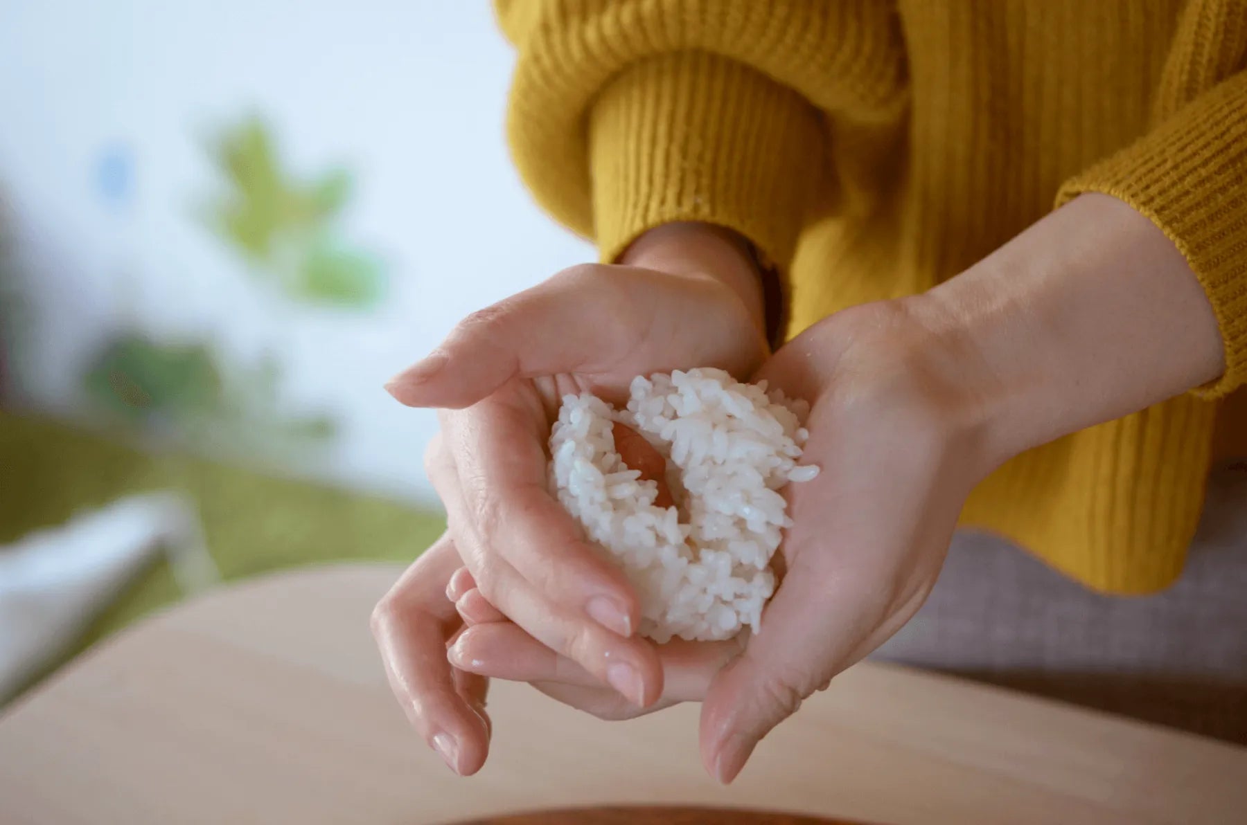 - 塩をつけた手のひらにお茶碗の半分くらい(90~100g)のご飯をのせる